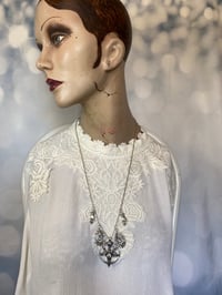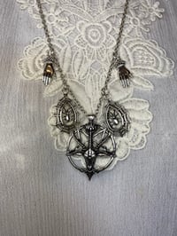 The focal piece of this necklace is a inverted goat pentagram,it also has spiderweb charms and little hand charms.
