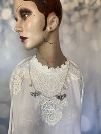 The necklace features a inverted pentagram as a focal point,it also has death's head moths and gold toned spiders.