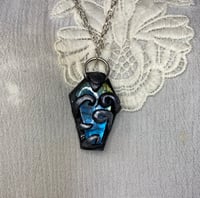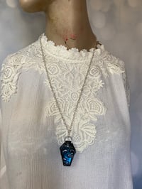 The necklace is made with a real Labradorite coffin and is incased in sculpted black epoxy resin.It comes on a 14 inch chain and the coffin is a little under 2 inches tall.