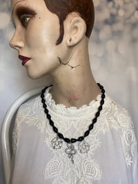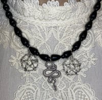 This is a upcycled vintage necklace with snake and pentagram charms.I think the beads are acrylic and the charms are metal.
