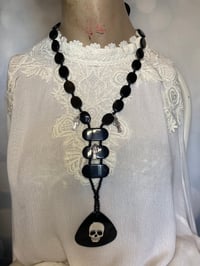 Necklace is a upcycled black vintage necklace with a skull focal point and mini Santa Muerte charms.It ties in the black with a black ribbon.